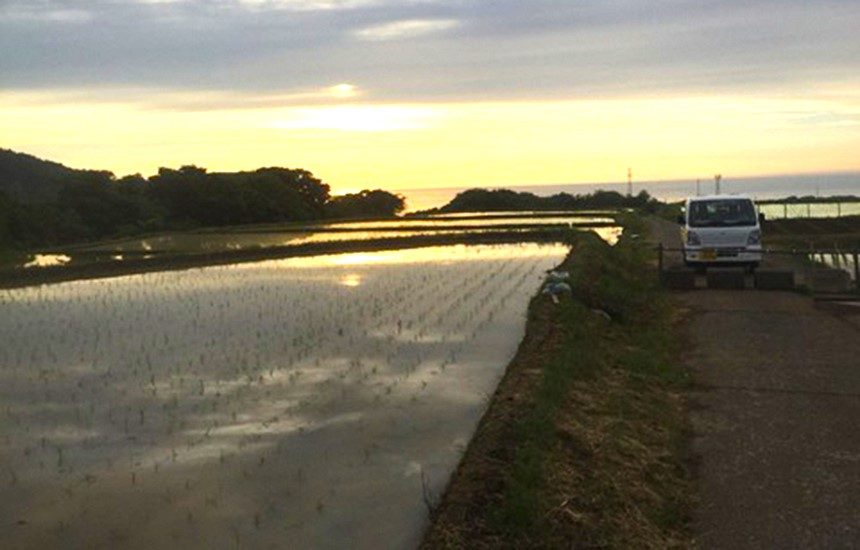 柏崎市の日本海に面した棚田です。棚田は新潟と北陸を結ぶ大動脈である北陸自動車道から海側へ広がっており、この中を国道さらにはJR信越本線が横切っています。棚田の上部から海側へ3kmにわたり棚田が続いており日本海に沈む夕陽の光景はとても見事です。比較的ゆるやかな勾配の棚田で海風が強いのが特徴ですが、真裏が米山という柏崎で一番高い山がありここからの清水に恵まれているエリアです。集落と生産者が一致協力して美しい棚田風景を残そうと保存活動に取り組んでいます。主な耕作者は集落外の農家ですが、水路管理や獣害除けの電気柵の設置など農地の保全を集落と協力して行っています。