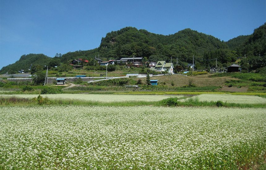 群馬県北西部に位置する中之条町赤岩は、山村集落と養蚕農家群として平成18年に文化庁から群馬県初の重要伝統的建造物群保存地区に選定されました。赤岩では明治以前から養蚕が営まれ、養蚕に適した頑丈な養蚕農家建築が行われてきました。2階建が多く、なかには3階建の建物が現存しています。さらに、上の観音堂・毘沙門堂・向城の観音堂・東堂・赤岩神社などの小さな宗教施設が点在し、蔵・小屋や道祖神、石垣や樹木、通り沿いの景色、棚畑や森林が一体となって、幕末から明治時代にかけての景観を今に伝えています。現在赤岩の棚田では転作として主にソバが栽培され秋には見頃を迎え、白い花が養蚕家屋の里を彩っています。