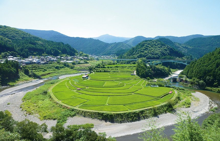 蘭島の棚田は、和歌山県中部、有田川の蛇行によってつくられた巾着袋のような地形の上にひらかれた棚田で、全国的に見ても珍しい形をしています。起源は江戸時代初期ごろで、水源は目の前の川ではなく約2.7km上流から用水路で引いており、ひらかれた当時の様子がほぼそのまま残っています。イベント時を除いて棚田は立ち入り禁止ですが、対岸の展望所からは自由に見られます。1996年に設立された景観保全保存会や、JAや公社、有志団体が主催して様々なイベントが行われています。また秋篠宮家ゆかりの地ということで毎年9月6日の悠仁さまの誕生日には竹灯籠による「キャンドルライトイルミネーション」で彩られます。