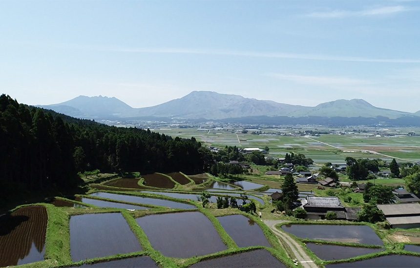 阿蘇五岳(涅槃像)を臨むこの棚田は、豊かな土壌と熊本名水百選にも選ばれた「乙川湧水群」の恵みを受け、良質米を生産するとともに、地下水の保全にも大きな効果を発揮していました。しかしながら、この美しい棚田も地域住民の高齢化や後継者不足から荒廃しようとしていましたが、2011年2月、耕作放棄地の解消と稲作による地下水涵養を目的として、阿蘇市と(公財)肥後の水とみどりの愛護基金との間で水田湛水事業に関する協定を締結し、以降手植え、手刈りといった伝統的農法に加え、化学肥料・農薬を抑制した環境にやさしい農業に取組んでいます。清流で育った米を天日で乾燥させる掛け干し米が毎年生産され、「阿蘇水掛の棚田米」として特許庁に商標登録しており、SDGsの一環として、地下水涵養に取り組む企業団体が増えています。