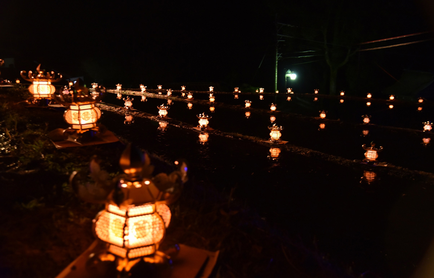 水面にうつる山鹿灯籠「棚田の灯り」(R2.10.18)