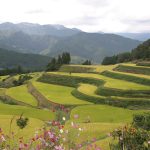急峻な山の斜面に城壁を思わせる無数の石積棚田があり、その山頂側に家々が建つように街並みが構成されており最盛期には映画館もありました。小学校は集落のはるか下の長者川沿いにあるため朝の通学は楽々ですが、帰宅は大変です。棚田を縫うようなつづら折りの帰宅路は下校という言葉のニュアンスとはかけ離れれたものとなっています。広大な石積み棚田は、まさに圧巻で幾重にも重なった棚田景観は他に類を見ない景観を誇っていました。現在では耕作放棄が進んで休耕田が目立ちますが、地元ボランティアグループや小学生たちが田んぼに花菖蒲を植える活動などを行って景観保全に努めています。400年前から受け継がれてきた長者の棚田は大迫力で、高知城の石垣と並び価値があるとされ、中島峰広氏の著書『日本の棚田』のカバーグラビアを飾っています。