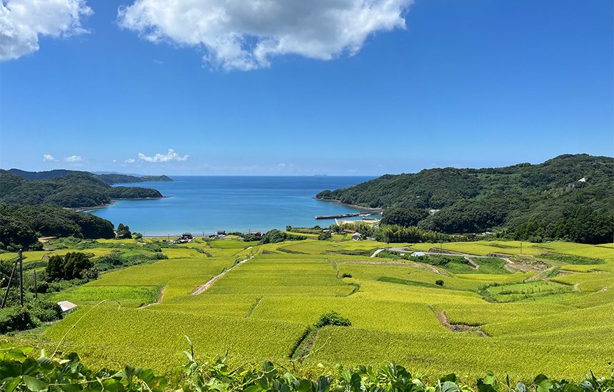 唐津市は、佐賀県の北西に位置し、玄界灘に面し、虹の松原や唐津城など風光明媚な都市です。駄竹の棚田は、肥前町にあり、農業者と平成12年度の発足した入野棚田組合が中心となり、農道・水路の草刈りや耕作放棄地の維持管理等、日常の維持・保全活動を積極的に行っています。また、肥前町棚田ウォーク実行委員会や肥前町産業祭実行委員会の主催するイベントに参加し、地元のモチ米を活用してぜんざいやきなこもち等を提供して棚田保全活動を積極的にPR活動を行っています。唐津市には、つなぐ棚田遺産に選定されている「蕨野の棚田」や「大浦の棚田」があり玄海町の「浜野浦の棚田」も近く見どころも多い地域です。