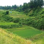 海南市は、県の北西部にあり海岸部は紀北臨海工業地帯に属し大工場の煙突が林立しています。内陸部はミカン・柿・桃・ビワなどの果樹栽培が盛んな農業地帯です。海老谷は市の南東部、内陸の標高500m前後の山が連なる長峰山脈の北斜面中腹に位置しています。景観が優れている棚田は、集落の最も高い部分で西向きの斜面に3列でそれぞれ30段近く並んでいます。この地はミカンの他に転作田での柿の栽培が盛んで「富有柿」、害虫に強い「平核無柿」、「刃根早生(はねわせ)」と呼ばれる渋柿などが生産されています。
