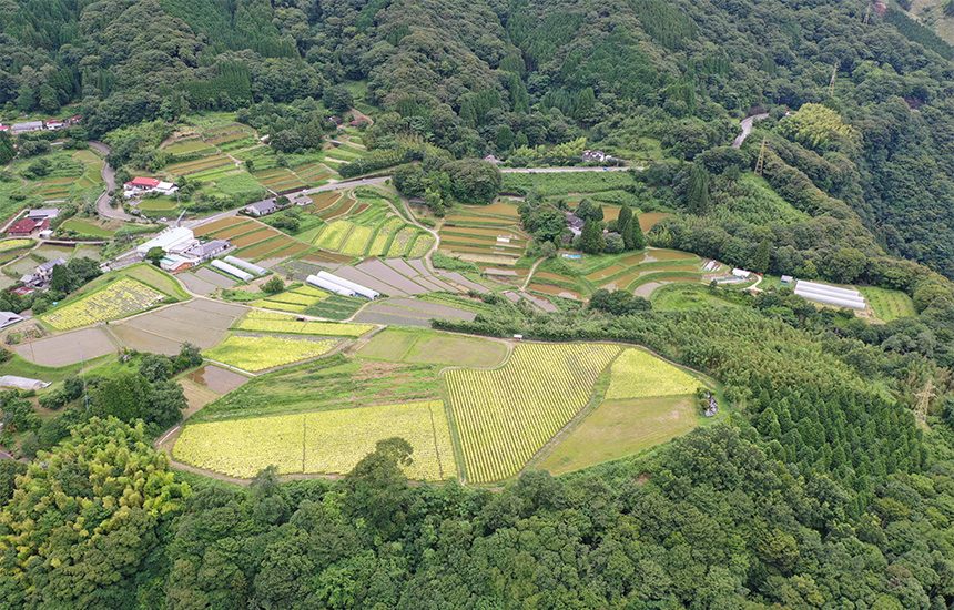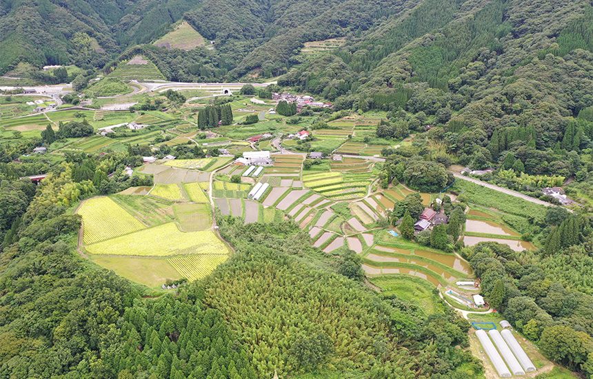 日之影町は宮崎県の北部にあり、大分県に接しています。深角集落は、南向けに開け三方を山に囲まれた盆地風な地形をなし、何処から眺めても人家や棚田が見渡せます。集落全体の高齢化により、棚田を含めた農地の維持管理が厳しい状況ですが、先人達から受け継いだ農地を中山間地域等直接支払制度の集落協定を中心に守り続けています。集落内には、九州中央自動車道 高千穂日之影道路の「日之影深角IC」があり、将来的にはアクセスも改善されると思われます。また、平成19年に宮崎県の無形民俗文化財に指定された「深角団七踊り」や宮崎県指定の日之影神楽である「深角神楽」により都市部との交流も積極的に行っています。令和2年度から耕作放棄地解消の取組として加工用かんしょを生産し、地元の酒造会社「姫泉酒造」により焼酎が製造される等、今後も販路開拓を図りながら農地維持の活動を進めています。