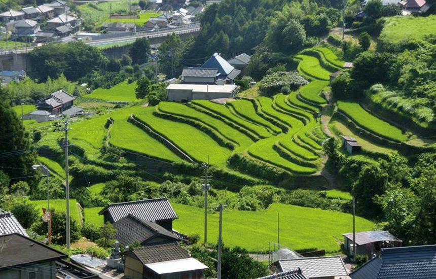 佐那河内村は『日本書紀』神代記によると、高天原で天照大神が御田とした名が村名になっています。加えて『古事記』には、村西方の牛小屋地区には三社さんと呼ばれる「天岩戸別神社」が祀られていることから佐那河内村の原点は「棚田」にあると言えます。日本に棚田多しといえど、村の名称が“棚田”に通じる意味を持っているのはおそらくここだけではないでしょうか。棚田は園瀬川を挟んで左岸側の西府能、右岸側の東府能の斜面に石積みの棚田が階段状にせり上がっていて、一枚一枚、奥行きは狭いが横に長く、美しい景観を形づくっています。ほかにも遠野地区、奥 野々地区、野神原地区などにも見事な棚田があります。