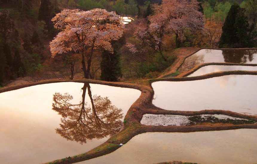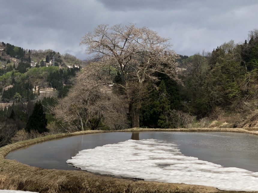 儀明は桜と棚田の組み合わせで有名。水鏡の田面に映り込む桜の光景は見事です。国道253号線沿えにあり眼下に広がる眺望の良い棚田ですが駐車場はありません。普段は路肩の余地に10台ほど停車できますが冬場の降雪の多い時期は無理かも知れません。風景の要である畦の山桜は本数も少なくかなりの老木で、満開といっても近年は弱々しい感じです。桜の開花時期は4月下旬頃ですが毎年異なり、しかも桜と秋水田んぼのコラボが見られるのはほんの4~5日間に過ぎず事前によく調べておかないと見ることはできません。この貴重な棚田も耕作者の高齢化で耕作断念の危機にありましたが、幸い首都圏からの支援団体により耕作が継続されることになりました。この棚田から約1km東側には蒲生(かもう)棚田がありますので合わせて見ることができます。