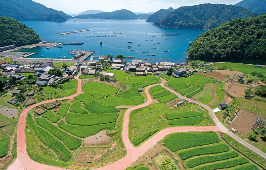 若狭を代表する山、標高693mの青葉山は「若狭富士」と呼ばれています。高浜町日引の棚田は青葉山の北側に位置し、リアス式海岸である若狭湾の一部、内浦湾に面しています。内浦湾は対岸の音海半島によってほぼ囲まれ、波静かな海面には50個を超えるフグの養殖筏と小舟、その外側には筏を守るための黄色く塗られた消波堤が浮かんでいます。