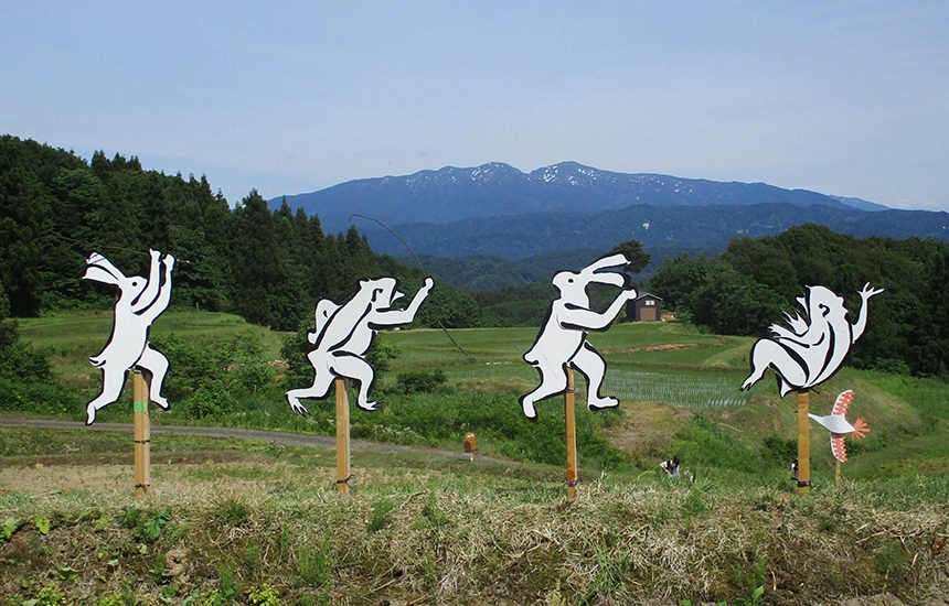 長岡市栃尾地区は新潟県のほぼ中央に位置し、守門岳の豊かな自然に抱かれた町です。比礼カカシアート棚田では、2009年から比礼カカシプロジェクトをスタートさせ、長岡造形大学の学生と地域住民の協働作業で制作したカカシが設置され新しい農村風景を作り出しています。このことにより、学生の作品の公開や地域住民との交流による社会性の醸成、地域の交流人口の増加と地域のアイデンティティの向上ばかりでなく棚田の景観価値に対する関心を高める効果と地域社会の維持、活性化の課題に対する活動として期待されています。