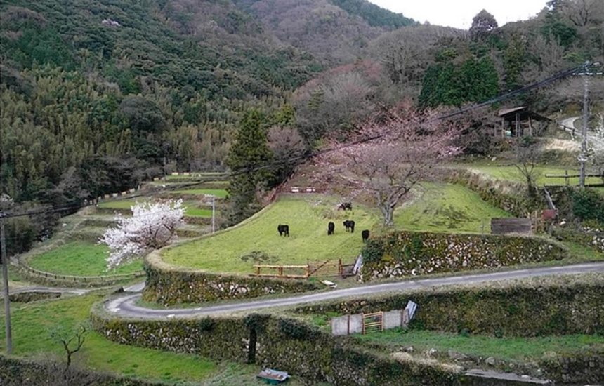 防府市は、山口県の中南部に位置し、瀬戸内海の周防灘に面しています。久兼野ノ下地区の棚田は、1級河川佐波川水系の久兼川上流部の谷間に石積み棚田が形成されています。野芝を食す放牧和牛の姿、棚田と山桜の景観は左右に広がる森林と相まって自然美あふれた景観のなか、耕作が営まれています。 石積みは、安政時代の毛利竹田城石工による石垣棚田といわれ、棚田を含めた保全管理により、国土の保全、水源の涵養など多面的機能の発揮が図られています。また、やまぐち型放牧による保全管理の省力化も行っており、今後見込まれる集落の高齢化や過疎化の進行に際しても、継続的な活動が後世にも継承されることが期待されています。