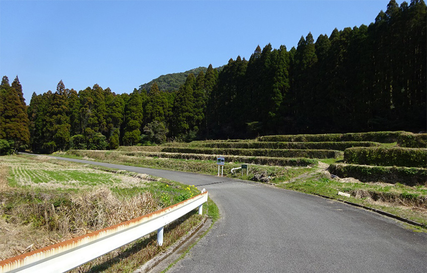 「ひよと松の棚田」は鹿児島県南さつま市大浦町の南部に位置する久保地区にあります。久保地区は三方を山に囲まれた中山間地域の農村地帯で南さつま市の中でも過疎・高齢化が進んだ地区です。同地区にある「ひよと松の棚田」は昭和初期に開墾され、平均勾配1/15の傾斜に石積みされた、面積約81.5a、20枚からなる棚田です。農家の高齢化、後継者不足により荒廃が進んでいた棚田を「久保地区むらづくり委員会」が復元させ、米作りを行っています。先人の苦労を偲びながら、棚田の持つ機能を守り、次の世代へ引き継げるように地区住民が一体となって保全活動を行っています。