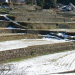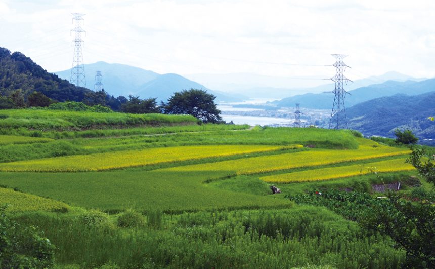 高浜町今寺は、若狭富士と呼ばれる青葉山の中腹に位置する集落です。お堂からは、今寺の集落全体と棚田を見渡すことができ、見上げると青葉山の頂上が見え、下を見ると若狭湾に面する青戸の入江が広がっています。棚田はお堂と熊野神社を結ぶ道を挟み東西に分かれて分布しています。山の中腹にあることから、田んぼの形は千差万別であり、様々な曲線を描いています。「百まち」と呼ばれる場所もあり、かつては、「百枚田」と呼べるような小さな田んぼがたくさんあったようです。