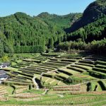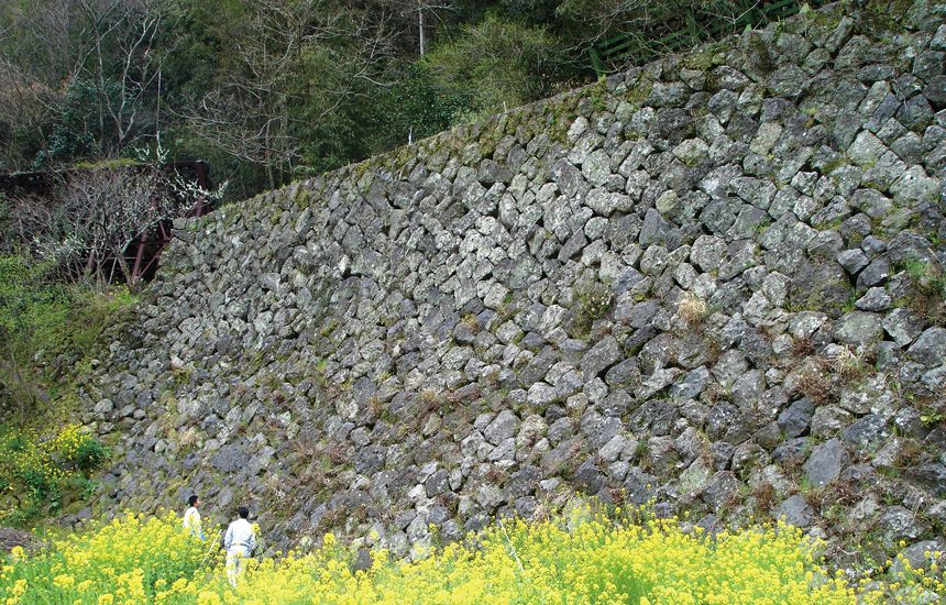 日之影町は神話の里で、棚田のある戸川集落に入ると立派な石積みの民家や蔵、塀、田畑に圧倒されます。江戸末期の嘉永・安政期には優れた石工達がいて、江戸城修復にも招かれたといいます。1.5kmも離れた水源渓流から引水し4戸分5aの開田が始まりで傾斜1/3の急峻な地形の城郭を見る様な立派な石垣の中には、高さ11mの石積みの畦があり国内最高の石垣を誇っています。