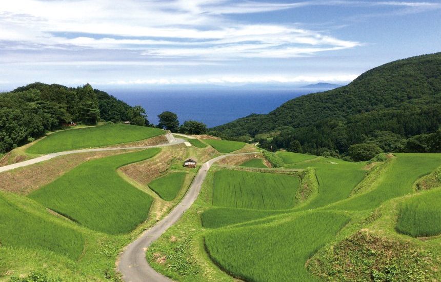 佐渡島は沖縄本島に次ぐ大きさを持つ離島。中世には身分の高い人の流刑地として、江戸時代には金銀山などの要所として、伝統文化や芸能が育まれた地で、トキの野生復帰に向けた人工増殖と放鳥の活動も有名です。トキはもともと稲作とともに繁殖した日本の農業を象徴する鳥で、佐渡島は「朱鷺と暮らす郷<さと>」として自然と共生する農業を模索し、2011年に「世界農業遺産(GIAHS)」に認定されました。棚田はこの農業遺産の中心的存在。なかでも小佐渡の南東部にある岩首地区の棚田は、海岸の集落近くから標高470mの急な山肌を延々と続いていて、竜が昇る姿に似ていることから「昇竜棚田」とも呼ばれます。南東方向に開けており、佐渡海峡から昇る朝日が棚田を照らす光景は全国的にも珍しいものです。最上部の展望台は訪れる人の憩いの場となっています。交流活動の拠点として長らく利用されて来た麓の「岩首談議所」は老朽化により閉鎖され、2023年からは地域振興の拠点として一般社団法人「岩首めぶきラボ」が活動を始めています。