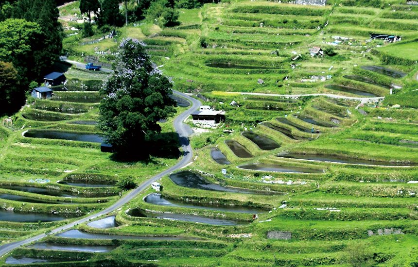 貝原は、約300年前にひらかれた森に囲まれた棚田です。一つ一つの田んぼは等高線に沿って作られていて、段差は小さく細長く広がっています。法面は石積みで、上が土坡になっているものが多くみられます。棚田の中央にはシンボルツリーとして親しまれている、推定樹齢700年、幹回り約5mの杉(通称おさんのうさん)が立っていて、5月になると幹に絡んだ藤の花が美しく咲きます。日陰の少ない棚田の休憩所でもあり、作業で疲れた体を横たえて昼寝をしている姿を以前はよく見かけました。棚田からは、岐阜県と滋賀県の県境にあたる国見岳などの山々が一望でき、見晴らしも素晴らしく、ぜひ散歩をして「おさんのうさん」の根元でくつろぎながら日々の憂いを忘れてほしいものです。