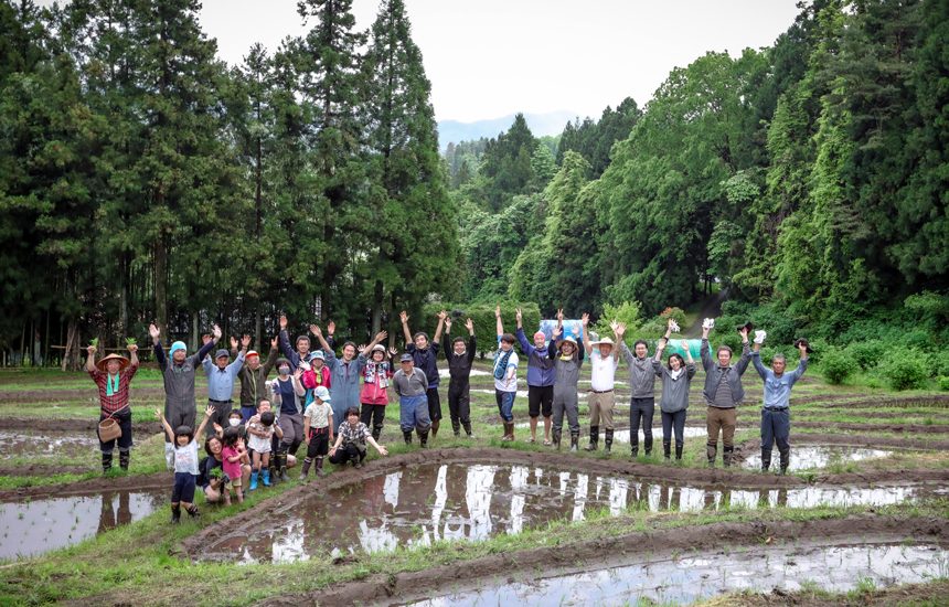 世界文化遺産・平泉で有名な一関市の東部、舞川地区唐ノ子(とうのこ)という小さな集落に金山棚田があります。北上川に流入する番台川の支流沿い、その最上流部の一軒家・金山さん所有の谷地田です。所有者の名前を冠した棚田は全国でも珍しく、江戸時代後期の開発といわれ面積は42aの小規模なものです。形は等高線型で、土坡の優しい曲線を描く棚田で、家より上に約70枚、下に約30枚ありますが、現在耕作されているのは約70枚。小さなものは畳2枚分ほど、大きなものでも10m x 3mほどの広さです。この大きさは、機械に頼らず人力のみで開拓できるヒューマンスケールの広さといわれています。素朴さと優美な曲線を兼ね備えた”可愛らしい棚田”として親しまれており、拓らかれた当時の姿がそのまま保全されています。耕作は長年にわたり金山夫妻が続けてきましたが、現在は「play farm(いちのせきシェア農園)」が中心となり多くの棚田愛好者の手により耕作と保全が行われています。