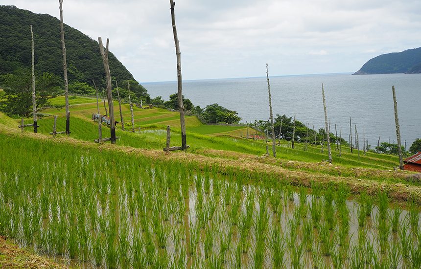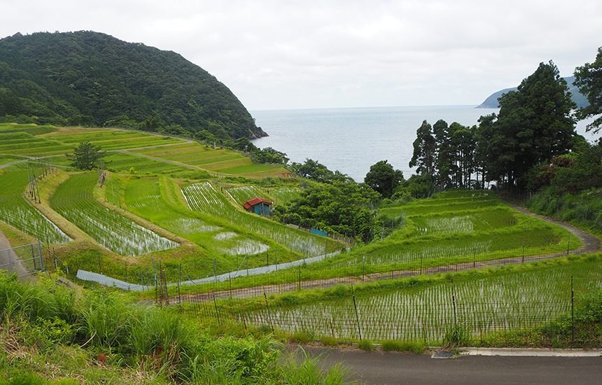 小浜市田烏(たがらす)集落に位置し、若狭湾に臨む国道沿いの美しい棚田です。田烏棚田とも呼ばれています。昭和60年代に行われた大規模な圃場整備により、小さな500枚程の田んぼから整然とした現在の姿になり作業効率が格段に上がったという。この地域では棚田を活用した積極的な地域振興に取り組んでおり、田植え後の5月と収穫後の9月には棚田の畦畔にキャンドルを灯す「棚田キャンドル」を実施しています。イベント時には棚田米のおにぎりも販売され、棚田の風景とともに味わうことができます。その他にも、棚田のフォトコンテストや舞台等も行われています。また、高校や大学と連携して棚田米を使った「へしこなれずし」の生産販売を行い、伝統食の継承にも取り組んでいます。畦畔には芝桜が植えられ4月には芝桜と棚田の景観を楽しむことができます。