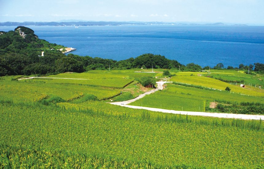 小豆島の6分の1の面積しかないのも関わらず地下水が豊富で多くの溜め池もあり、早くから稲作が行われてきましたが過疎化による後継者不足で衰退の道をたどっていました。2010年瀬戸内の7つの島を舞台にした瀬戸内国際芸術祭開催に合わせ、棚田の一部が復田され35枚前後の棚田が蘇りました。このほか、豊島美術館(世界的な建築家として知られる西沢立衛氏が設計)の周辺の棚田も復田されています。現在も、唐櫃岡地区から浜地区にかけて棚田の再生作業が行われていて、耕作されていない田でも草刈りがされて、景観が保たれています。