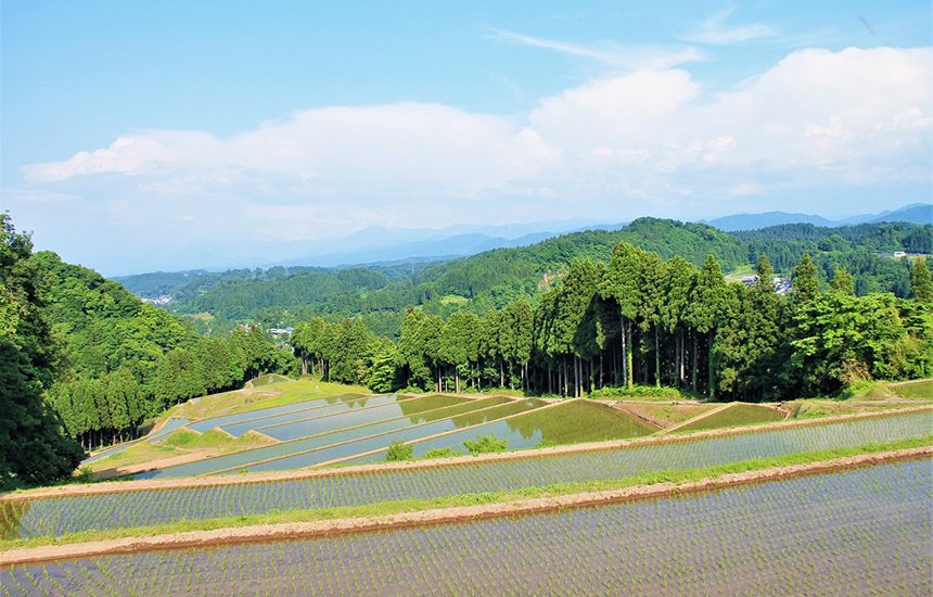「おわら風の盆」で有名な富山市八尾地域西部の中山間地域に位置する棚田です。圃場整備された長方形の田んぼが整然と山間部に広がっています。この地域では、国の「中山間地域直接支払制度」を活用して農地の維持管理や鳥獣害対策を集落全体で取り組んでいます。また、水稲の作付けが難しい農地では、エゴマやブルーベリー、ソバやショウガを栽培することで荒廃農地の発生防止だけでなく特産品の開発にも取り組んでおり、JAの直売所等で販売されています。特にブルーベリーは購入者から好評を得ています。より美しい景観にするため、畦畔や農地にはコスモスや彼岸花が植えられており、秋にはソバの花と合わせて美しい風景を楽しむことができます。