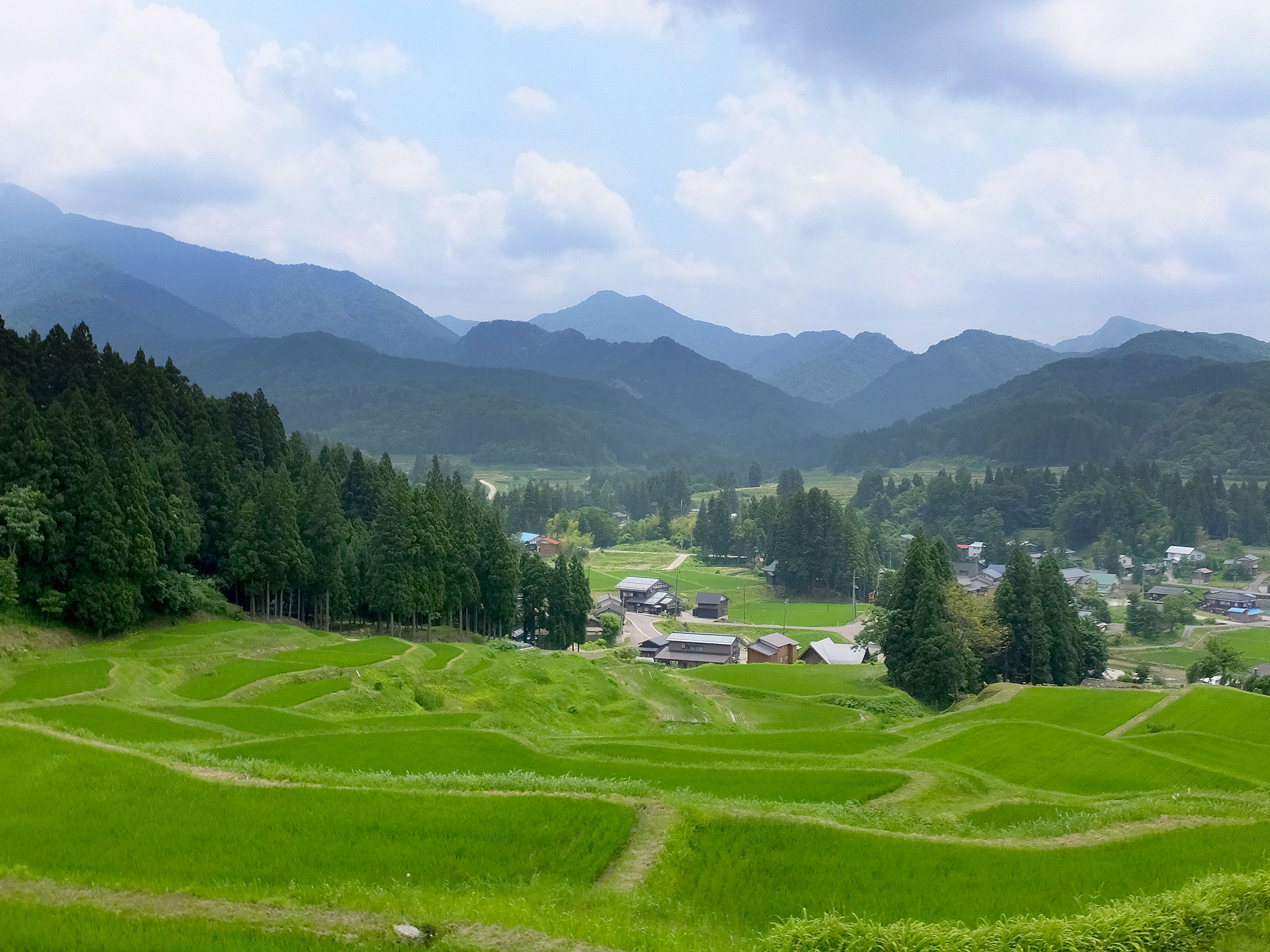 新潟県内では頸城<くびき>地方以外で唯一選ばれている「日本の棚田百選」地。田んぼは北五百川集落の東と西の谷に分かれていますが、面積の狭い西の谷の方が景観的には見応えがあります。守門<すもん>岳などの山々に囲まれ、冬には2~3mの雪が積もる豪雪地帯です。