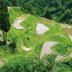 松之山温泉街から越道川の上流約1kmに天水越集落がある。狐塚の棚田は、さらに最上流の標高600m~550mにかけての谷の斜面に広がっており、集落から離れた静かな場所にあります。日本の棚田百選に選ばれた後に圃場整備され、長方形の田んぼが連なっているため、直線的で広々とした景観が楽しめます。江戸時代安永から寛政年間にかけての開田と推測され、かつては狐塚の千枚田といわれてきました。一枚が数アールの小さな棚田であったが、留山ダムの完成で用水が利用可能になり、広い田んぼにすることができました。豊富な雪解け水がブナ林という緑のダムに蓄えられて棚田を潤しています。棚田の隅々には数棟の作業小屋がみられますのも特徴です。この小屋は集落から歩くと1時間以上かかるので、休息や寝泊り農具置き場として使われてきました。