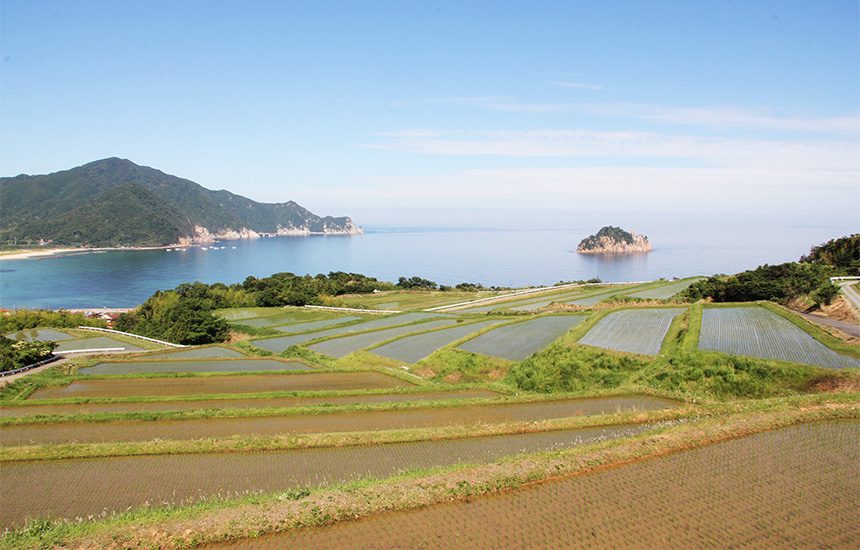 阿武町は山口県北部の日本海に面しており、山腹に広がる木与の棚田は、元は山腹に挟ワイな畑が広がる段々畑であったが、江戸時代の伊能忠敬による全国測量の際、水路等の測量と設計が行われ、明治時代に河川から約2㎞の水路を引き豊かな棚田に変貌しました。その後、平成9年度に国営圃場整備工事により、効率的な営農が可能となりました。この棚田で収穫されるお米、「木与なぎさ米」は日本海からの潮風により、ミネラルたっぷりのブランド米として販売しています。棚田は日本海沿いに走る国道からも見上げることができ、棚田から見下ろす日本海は素晴らしい景観であり、「やまぐちの棚田20選」にも選定されています。また、道の駅阿武町に隣接したキャンプ場の、体験プログラムのメニューとして木与の棚田での農村交流体験を開設しています。