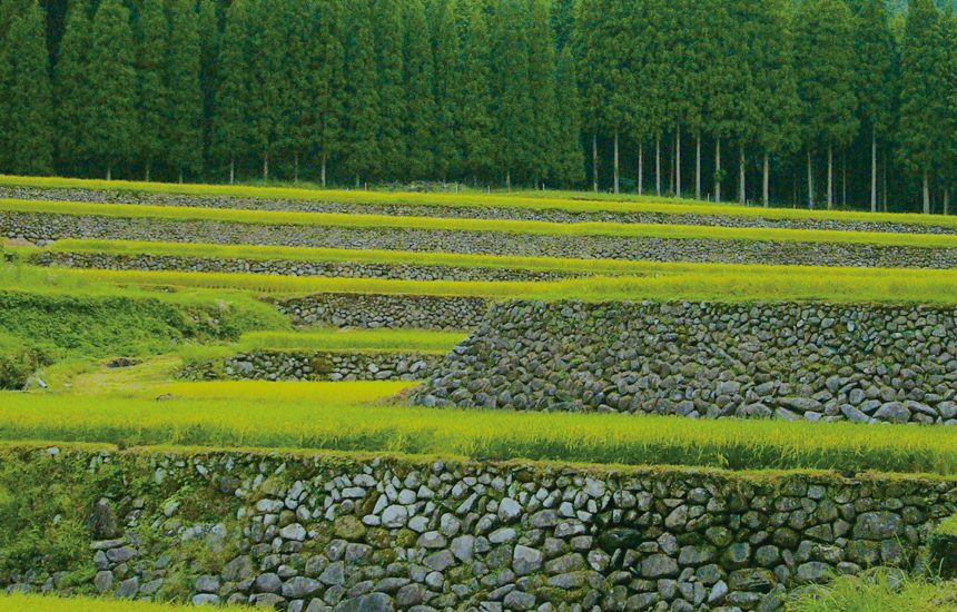 湧水町は霧島連山の西麓にある。その名のとおり霧島連山に降った雨水が長い時間をかけて地中を通って町内のいたるところに湧き出ています。湧水町ではその豊富な湧水を生活水や農業用水に利用し、特に農産物生産などに活用されています。幸田地区は市街地から7kmほどの旧栗野町の西部、国見岳の東方にあり、棚田は連山の森林に囲まれています。棚田の法面は石積みであるが、百数十年前に城の石垣を造った石工たちにより積まれたといわれており、城の武者返しのような反りをもった全国的にも珍しい石積があり、「水田のお城」と呼ばれています。幸田は南国鹿児島では珍しく雪の多い地域であり、南国の棚田での冬景色は格別です。