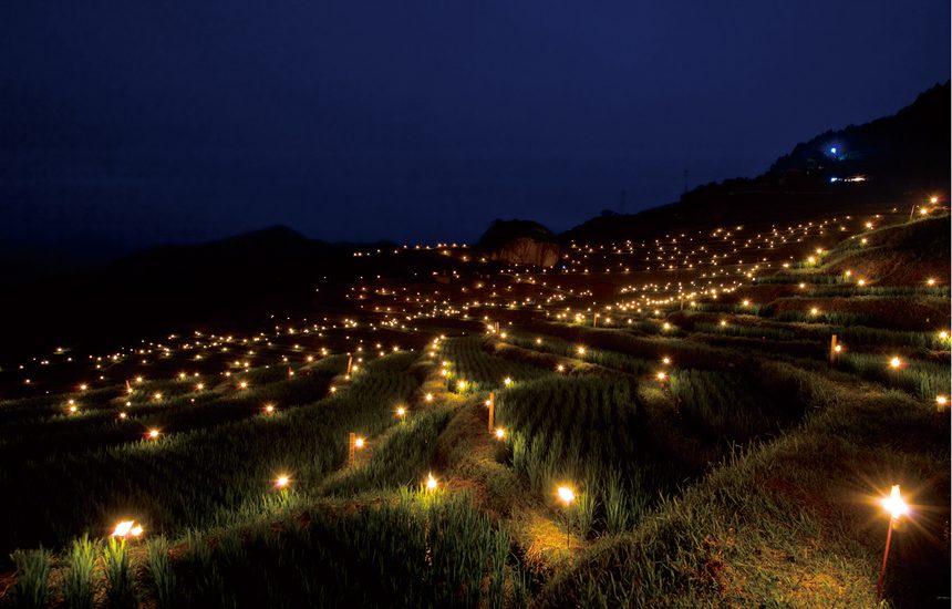 毎年6月:丸山千枚田の虫おくり(夜は畦道に1340本のろうそくを灯す)