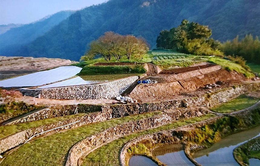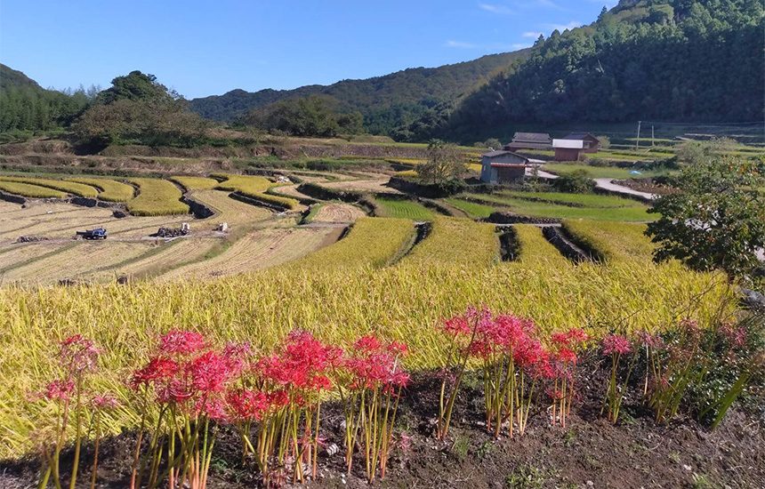 密乗院の棚田がある国東市(くにさきし)は、有名な国東半島の東半分を占めるとともに大分空港を抱え、交通と豊かな自然環境に恵まれた地方都市です。また、1300年の歴史があるといわれる寺社・仏跡など数多くの史跡がある地域としても知られています。国の「つなぐ棚田遺産」に選定された密乗院の棚田は、大分空港の西約10㎞の国東半島山麓に位置し、豊かな湧水を活用した稲作が盛んなうえ集落協定の農業者らが中心となり鳥獣対策として地域全体への金網柵設置や、法面へのミツマタ・アジサイ植樹など景観保全と生物多様性の活動に取り組んでいます。棚田の用水路には淡水シジミが生息し、ホタル観賞ができる環境が維持されています。近年では「み仏の里くにさきウオーキング」・「国東おだやか博 密乗院の棚田トレイル」、更には伝統行事として豊富な湧水に感謝する「お観音様祭り」等により棚田の認知度は向上してきています。平成 31年には景観法に基づく「国東市景観計画」により景観形成重点区域(世界農業遺産モデル地区)に指定され良好な景観形成がさらに促進されています。