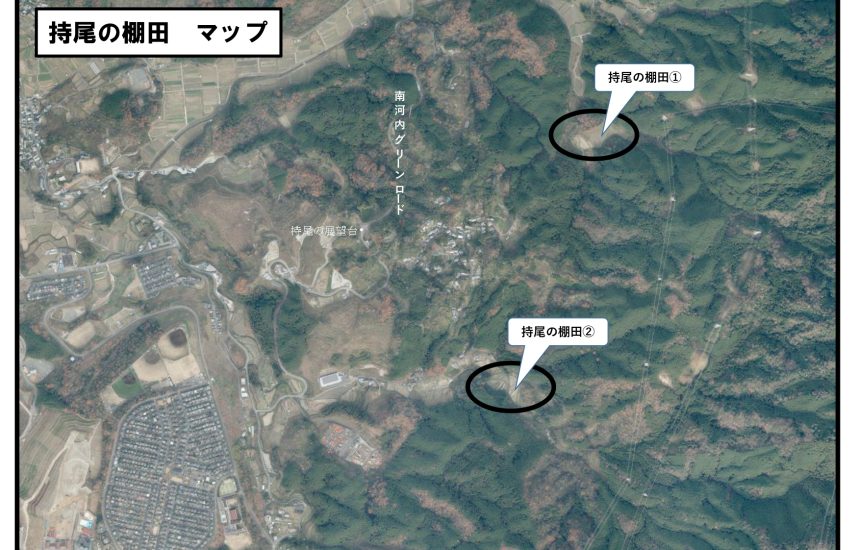 | 自動車 | 南阪奈道・太子ICから南河内フルーツロードを約6.3km南下した交差点(持尾方面の標識)を左折し500m進むと「持尾地区集落センター」に着く。この集落センターから北東方向700mに「持尾の棚田1」。集落センターから南方向800mに進むと「持尾の棚田2」に着く |