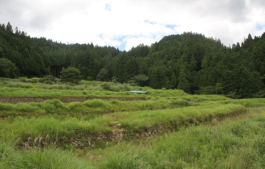 明治時代から昭和20年にかけて開田された、比較的新しい田。畦は主に石積み、直線状の矩形の棚田です。案内板がないため集落周辺の田を誤認する例が多いようですが、集落からは県道427号線をはさんだ反対側の山の中にあります。「日本の棚田百選」に選定された時には90枚の田を16軒で守っていましたが、獣害が酷く、高齢化もあって耕作を断念する農家が増加。草が生い茂り、往時の景観をしのぶことはできません。