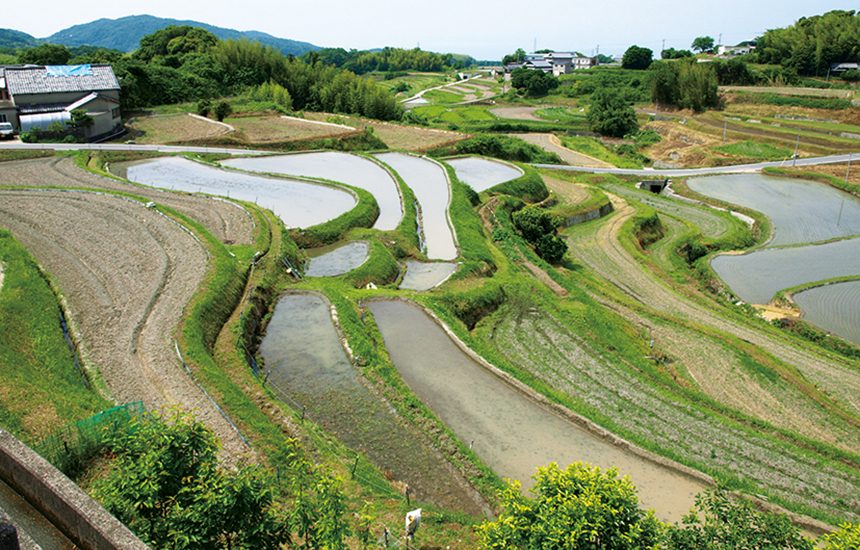 兵庫県淡路市長澤は、淡路市の南部、島の中央部標高200m~250mの丘陵地にあり、淡路の奥座敷と呼ばれています。棚田は、県道123号から東山寺に向かう市道沿いに、集落の谷間を埋めるようにして分布しており、なかでも細子池付近、長澤会館付近、大師堂付近の棚田は、規模も大きく景観も優れているといわれています。用水は、瀬戸内型の雨の少ない気候で、大小の数多くの溜池に依存しています。淡路島では溜池の受益者のことを田主(たず)と呼び、4~5つの池の田主になっている人もいます。長澤では地元の企業を退職後、農業専従者になり、元気な高齢者と自称する人達が、中山間地直接支払等集落を支える組織の役員と協力しながら、集落に活力を与えています。