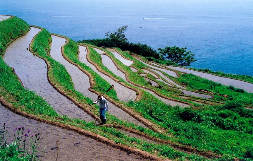 京都府伊根町は、京都府北部、丹後半島の北端に位置し、日本海に面し南は宮津市に接し、豊かな自然に恵まれ、舟屋と伝説に彩られた町です。新井の千枚田は、丹後半島を1周する国道178号線を新井に向かい大原集落から町道に入って、しばらくすると町道から下に急崖にへばりつくようにして若狭湾に向かって開かれています。等高線に沿う細長い形で、幅は狭く数メートルほどのものが多く見られます。千枚田を背後に若狭湾上の冠島と沓島が捕らえられた写真は、写真愛好家に人気のスポットとなっていました。千枚田は1970年代には800枚ほどありましたが、残念ながら現在は全て耕作放棄され、この写真の光景とは全く異なりますので訪問時は注意が必要です。