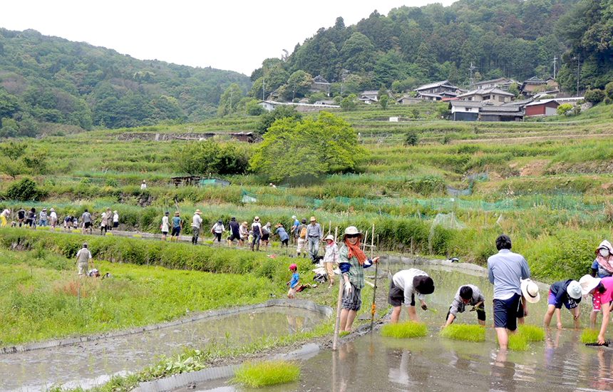 生駒市は、奈良県の北西端に位置し、大阪府と京都府に接する自然環境と交通の利便性を兼ね備えた町です。棚田のある西畑集落は、奈良盆地と大阪平野を分ける生駒山の南側に位置し、集落の道は「暗越え奈良街道」として難波と平城京を結ぶ最古・最短の道として有名です。この街道沿いに、石垣積みの美しい棚田が広がっています。近年、休耕田が増え、荒廃が進んだことから2002年に「西畑棚田を守る会」が結成され、翌年には大阪のNPO法人との協力によって「いこま棚田クラブ」が生まれ、地元と都市住民とが力を合わせ棚田を保全する様々の取り組みが行われています。