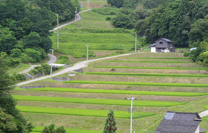 佐渡島の東側にはいくつもの谷筋に沿って棚田が拓かれています。月布施棚田の南隣の谷筋にそった棚田です。海岸の城ヶ鼻灯台から山頂に向かい標高 mに至る高度差 mまで約5㎞にわたり棚田が存在します。写真は海岸沿い部分と山頂部の2点です。いずれの田んぼも道路が整備され車で20分ほどで登れますが車の無かった時代には農作業は大変だったようで現地の作業小屋で寝泊まりしたといわれています。