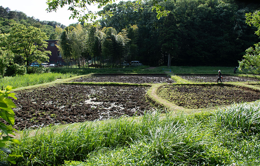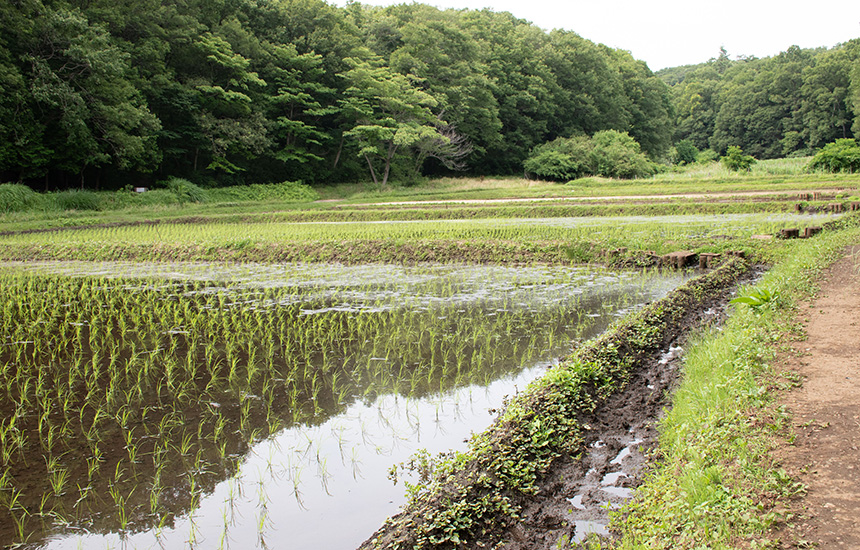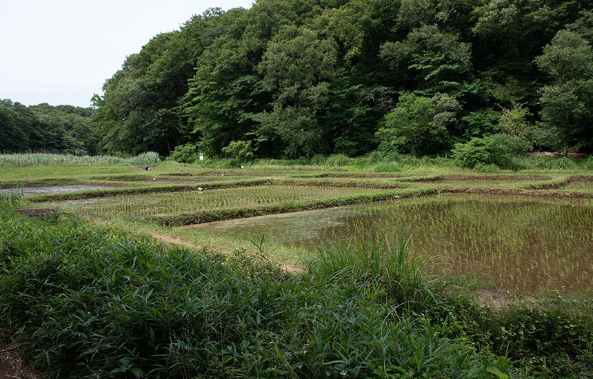 「野山北・六道山」谷地田は緑地帯西側の谷戸の一つ宮野入谷戸にあり、典型的な谷地田で畔の高さは50㎝前後の緩やかな勾配の田んぼが並んでいます。この谷地田の特筆すべきは「復田」です。昭和40年代に客土の名目で周辺地から建設土砂が持ち込まれ「谷地田」は消滅してしまいました。その後、東京都は環境保全に取り組みダンプトラックで大量の残土を運びだし谷地田が再び顔をだしたのです。平成12年には谷戸の入り口に江戸時代の農家を復元した「里山民家」がオープンし、憩いの場を提供するとともに野山北・六道山公園ボランティア(300人超)の活動拠点施設として活用されています。