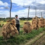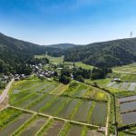 宮城県の最も南に位置する丸森町は、阿武隈川が流れる自然豊かな町です。この阿武隈川の支流の一つ雉子尾川(きじおがわ)が丸森町大内青葉地区で大きく蛇行しています。この蛇行する内側が扇形の美しい棚田で「棚田カード」の一枚となっています。大内青葉集落は農業用水の確保が困難な場所も多いうえに、農地の陥没や地滑りが起こりやすいという厳しい自然環境の中で、養蚕業や林業、炭焼きなどの仕事を一緒に行うことで今日まで農地を守ってきました。集落には法面を土で固めた土坡の棚田が数カ所に点在しており、水稲のほかエゴマや大豆、ブロッコリーなどを主に栽培しています。