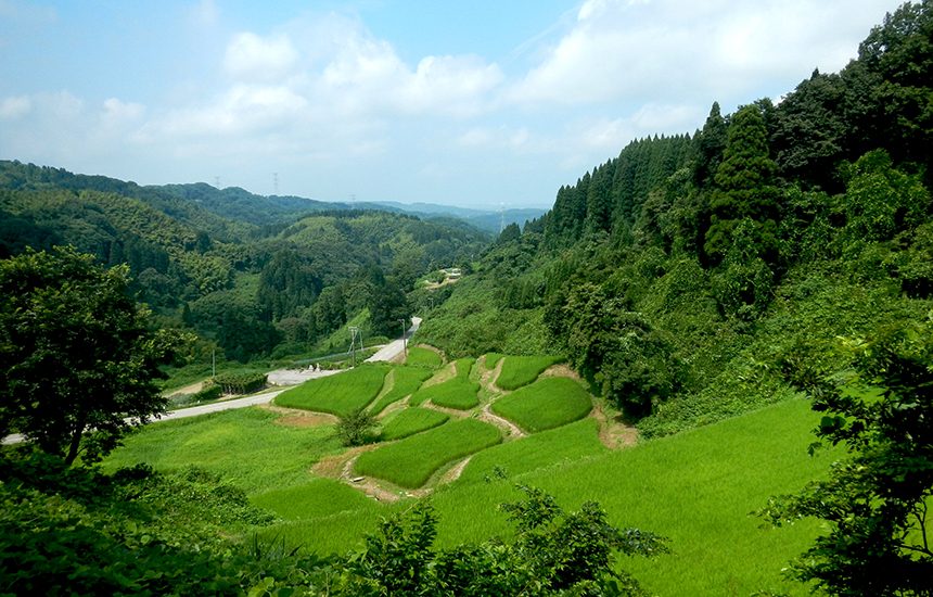 石川県と富山県の境に位置する棚田で雲形定規のような特徴ある形をしています。高台の展望台は駐車場もあり棚田越しに遠く日本海を望むことが出来る素晴らしい景観ですが、近年は耕作放棄地が増えており残念な限りです。倶利伽羅峠の戦いとして有名な源平の古戦場と日本三不動尊のひとつである倶利伽羅不動寺に近い。ここ奥山田は、県境の峠ということもあり、古くは交通の要衝として峠には茶屋もあったとのことです。津幡町内には、この棚田からすぐ近くに「つなぐ棚田遺産」に選定された中原の棚田があります。