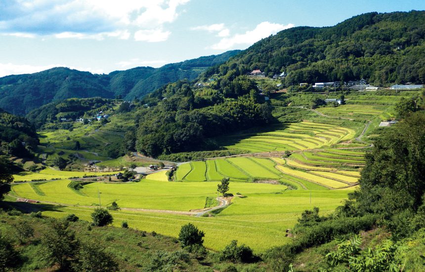吉備高原は、新潟県の頸城丘陵と並んで全国有数の棚田の多い地域です。大小の棚田が織りなす縞模様が緩やかな曲線を描き春の若草、初夏の田植え、秋の稲刈り、冬の雪景色まで四季を通じて見どころがあります。棚田の法面は、基部が石積み、上部が土坡になっていて「畝町直し」が行われたことを示しており、1枚が5a前後の大きめの田が多くあります。