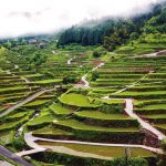大中尾棚田のある外海地区は隠れキリシタンの里として知られ、遠藤周作の代表作の一つ『沈黙』の舞台となった町でもあります。地区のそこここにキリスト教文化の影響が残っており、2018年には「潜伏キリシタン関連遺産」として世界遺産に登録されました。棚田は日本一の清流に選ばれたこともある神浦川(こうのうらがわ)左岸の丘の上に広がっています。棚田のいちばん高いところからは角力灘(すもうなだ)越しに五島列島まで眺めることができます。