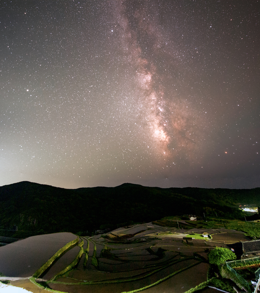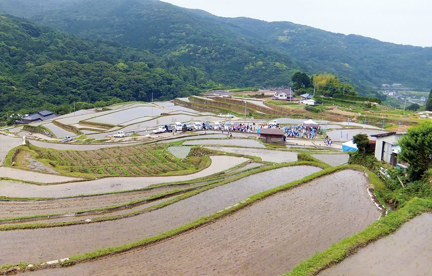 開田は今から約270年前の江戸時代中ごろ、大村藩によるといわれています。棚田を潤す水路は「大井手水路」と呼ばれ、200年ほど前に開削されました。神浦川の上流から4キロ以上の長さで引かれており、毎年春先にはボランティアも参加して水路の掃除が行われます。この棚田の石積みは、地元で女石と呼ぶスレート状の結晶片岩と、男石と呼ばれる玄武岩の組み合わせで作られています。玄武岩を下に据え、細工が比較的容易な結晶片岩を上に積み重ねたもので、数個の玄武岩を中心に据えて周囲に結晶片岩を積んだものなど一見無造作に積まれているように見えるがとても堅固です。