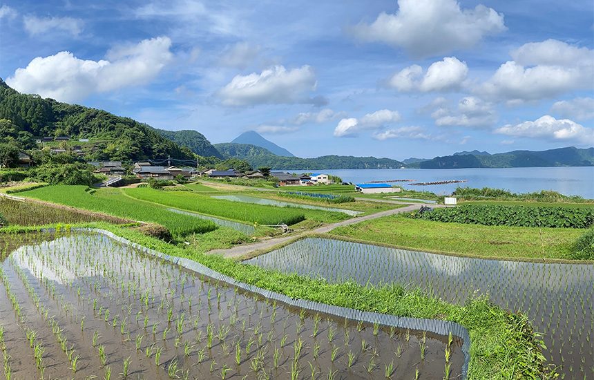 指宿市は、薩摩半島の南端に位置し、指宿温泉で知られています。棚田は九州最大の湖池田湖の東側に面しており、平家の落人伝説もある尾下集落に寄り添うように広がっています。棚田のほとんどが高い石積みで形成され、湖を挟んで開聞岳を望むなど美しい景観を有しています。また、棚田では、棚田米のほか「田芋」という鹿児島の伝統野菜も栽培されており、「尾下の田芋田」は重要な文化財として、市の有形民族文化財にも指定されています。棚田を核とした地域振興のため、農作業体験ワークショップを実施するなど、地域外住民との関係人口の創出に努めています。また、集落内にあった商店跡を今後の活動拠点とし、棚田でとれた作物を加工販売する施設にするための改修にも取組んでいます。