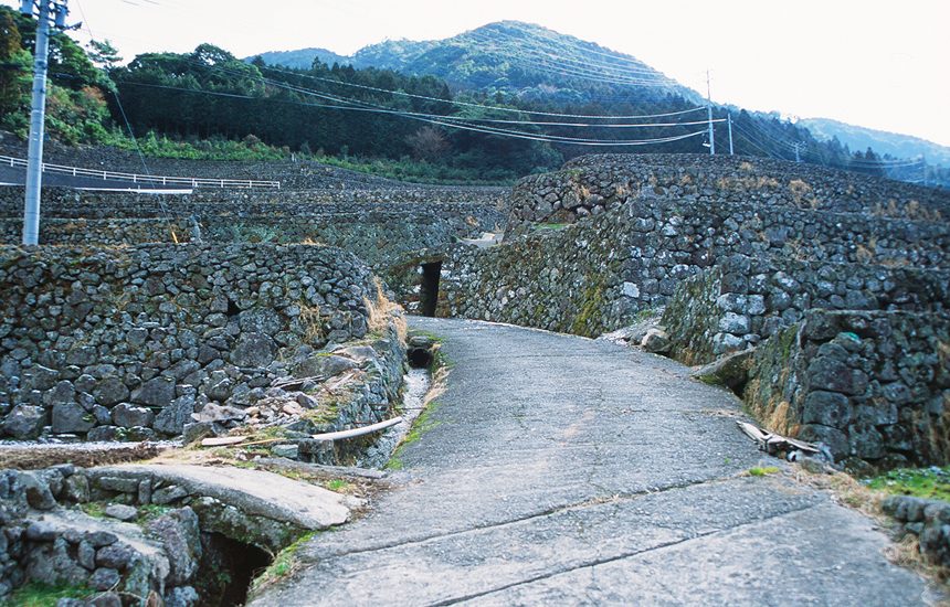 雲仙市の橘湾を望む旧千々石町に清水棚田はあります。「つなぐ棚田遺産」にも選定されており「ちぢわ棚田」とも呼ばれています。雲仙岳(普賢岳、妙見岳、野岳、九千部岳の総称)の西斜面にひらかれ清水と岳地区からなります。そのため「清水棚田」は一般に「岳棚田」と呼ばれることも多いです。この棚田の注目点は、近年の普賢岳火砕流に見られるような巨大な土石流跡地に構築された棚田ということです。甚大な被害をもたらす土石流であるが、自然災害と共存しながら築き上げられた島原半島の雲仙岳の織りなす風景は見事であり、1934年日本で最初に指定された国立公園であることも忘れてはなりません。棚田はこの山系の千々石川の上岳(上清水)と少し下流の下岳の棚田で構成され、下岳は谷幅が広く棚田の面積も広い。上岳集落は千々石川の支流である清水川沿いも含まれており、百選の棚田の名称が「清水棚田」となったのはこのためです。