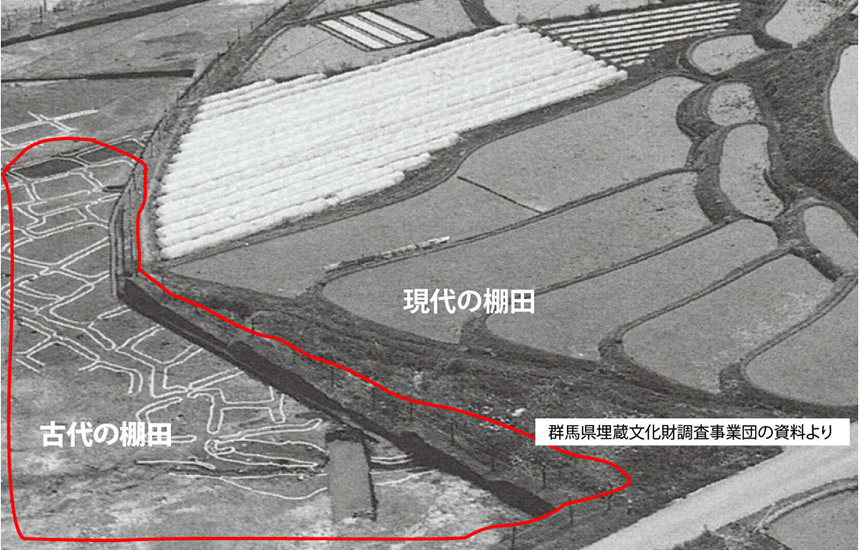 利根川と片品川の合流地点近くの小高い台地の棚田で、古墳時代の棚田発見で注目された棚田です。1988年のことです、国道17号のバイパス工事で過去に例を見ない発見がありました。何と現代の棚田の地下に古墳時代の水田(棚田)が発掘されたのです。棚田西側に位置する浅間山は1500年前(西暦550年)に大噴火し西風に乗った分厚い降灰で沼田地域は埋没してしまいました。埋もれた古墳時代の下川田は10数戸の竪穴住居、縄文土器、貝殻や籾と共に棚田状の小さな田んぼが数十枚発見されたのです。積もった降灰の表面も数百年もの長い年月を経ると草木の腐葉土などで数十㎝の沃土が形成され新たな棚田が古代の棚田の上に構築されるとは驚かされます。(「棚田に吹く風」116号より引用)