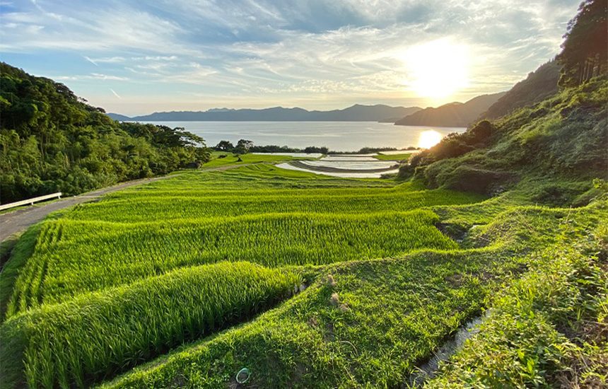 指宿市は、薩摩半島の南端に位置し、指宿温泉で知られています。棚田は、九州最大の湖である池田湖の東側に位置し、清見城の城主であった池田信濃守が、石を積んで棚田にしたのが始まりとと伝えられており、棚田の中には由来や形状の異なる3体の田の神様が祭られています。棚田は、美しい景観から、大河ドラマ「篤姫」の撮影地にも選ばれ、きれいな湧水で作られた棚田米は、「天皇陛下献上米」にもなっています。この美しい景観と歴史を有する棚田を後世に残すため、棚田の畦畔及び水路の維持管理作業を定期的に行い、稲刈り後にコスモスや畦畔に彼岸花を植栽する等、より良好な景観の形成に取組んでいます。また、稲刈り体験の実施や地元小学校と連携した餅つき体験等の交流事業を実施し棚田文化の継承にも積極的に取組んでいます。