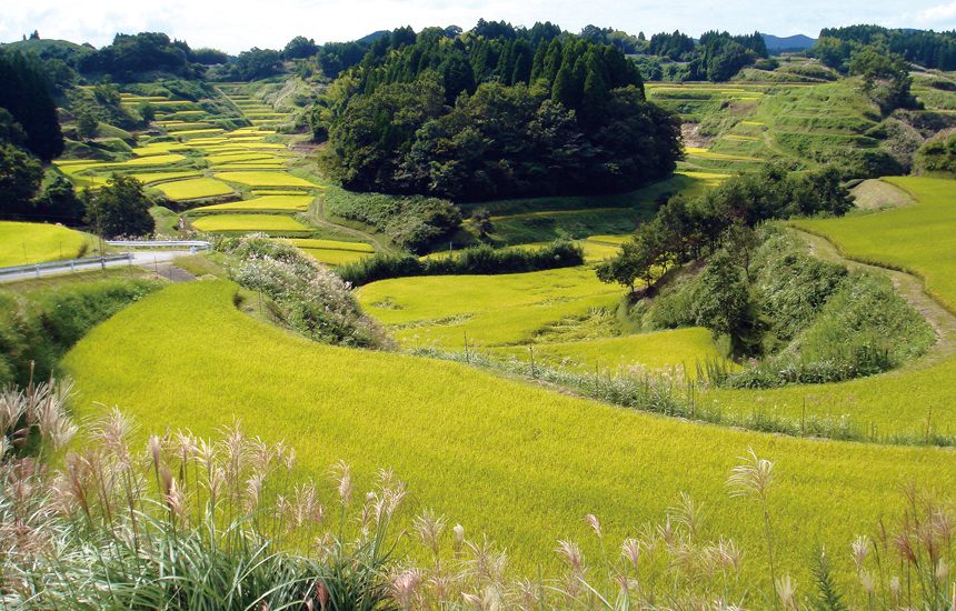 白糸台は、山都町の中心街南の緑川の右岸にあり、阿蘇外輪山の裾野の四方を河川に囲まれた台地です。農業土木遺産として燦然と輝く通潤橋の用水路開削によって白糸台地各所に約118haの棚田がひらかれました。通潤橋とは、水の便が悪く水不足に悩んでいた白糸台地に住む民衆を救うため、江戸時代の惣庄屋・布田保之助(ふたやすのすけ)が、1854年に肥後の石工たちの持つ技術を用いて建設した石橋です。約6km上流にある取水堰から流れてくる通潤用水を白糸台地へ流すための日本最大級の石造りアーチ水路橋で、国の重要文化財に指定(昭和35年)されています。1855年に通潤用水の完成以降現在まで地元住民の手で維持管理が行われており農業のみならず白糸台地の住民にとって生業の根幹となっています。2016年に発生した熊本地震で白糸台地の棚田は崖くずれなどで大きな被害が発生しました。山都町のシンボル「通潤橋」は、漏水やひび割れなど軽微な被害を受けました。