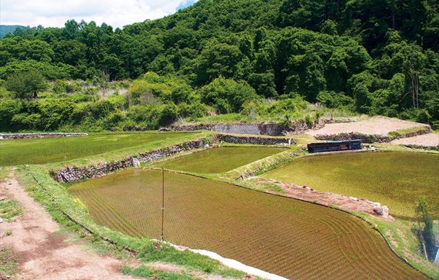 東御市(とうみし)は2004年に東部町と北御牧村が合併して誕生した長野県東部の自治体です。北は浅間連山、南は蓼科・八ヶ岳の雄大な山並みが見られます。市内を東西に流れる千曲川と合わせて美しい風景が広がります。滝の沢棚田は湯の丸山南斜面沿いの自然豊かな千曲川の北側約5㎞の祢津地区に位置しています。不規則な形をした石積みの棚田が沢に沿って集落を取り囲むように美しく続いており、秋にはハサ掛けの風景が見られます。集落の上部側もかつては美しい棚田だと思われますが、現在では荒れ果てた耕作放棄田が広がっています。周辺には歌舞伎舞台など県や市指定文化財が多く存在し、歴史的文化が多く残っている地域となっています。