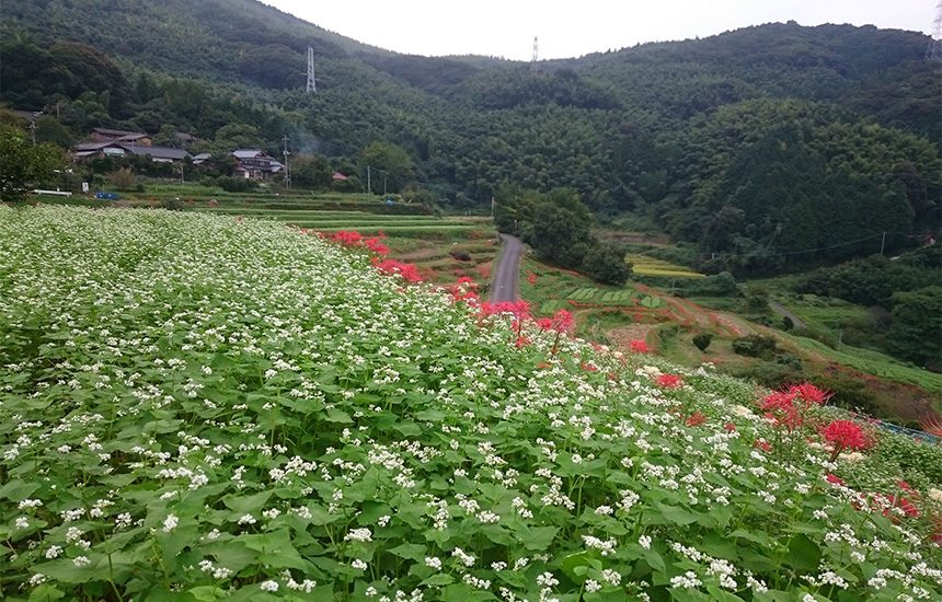 等覚寺の棚田は、福岡県苅田町(かんだまち)の山あいにあり、山伏が拓いたといわれる1000年の歴史ある棚田です。町の中心部からは車で20分ほどの距離に位置します。標高約300mの棚田は優美な曲線を描き、晴れた日には市街地や豊前海を見渡せるなど景観も抜群で、平成4年には農水省から「農村景観百選」に選ばれています。棚田は大型の機械は使えず、歩行型の耕耘機や田植え機など人手のかかる稲作に加え、年々拡大する鳥獣害にも悩まされています。住民の高齢化に伴い休耕田も増えつつあり景観保全として蕎麦やコスモス栽培にも取り組んでいます。平成25年には「等覚寺地区景観保全協議会」が結成され、地域・町役場・ボランティア団体を主要メンバーに産学官連携での棚田保全活動が行われています。農作業体験イベントとして家族での田植えや稲刈り、野菜の収穫などを行っており、なかでも蕎麦をテーマにした「大人のそば育」は人気講座となっています。