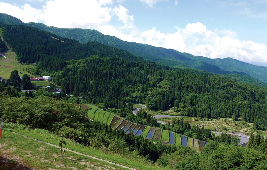 若桜・氷ノ山スキー場にある氷ノ山高原の宿「氷太くん」から眺めると、トランプを滑らせた様な形状は美しく、訪れる人の心を和ませています。また、小さな田んぼが段々に重なる自然と人工の織りなす独特の造形美は、今後も守り続けたい風景となっています。