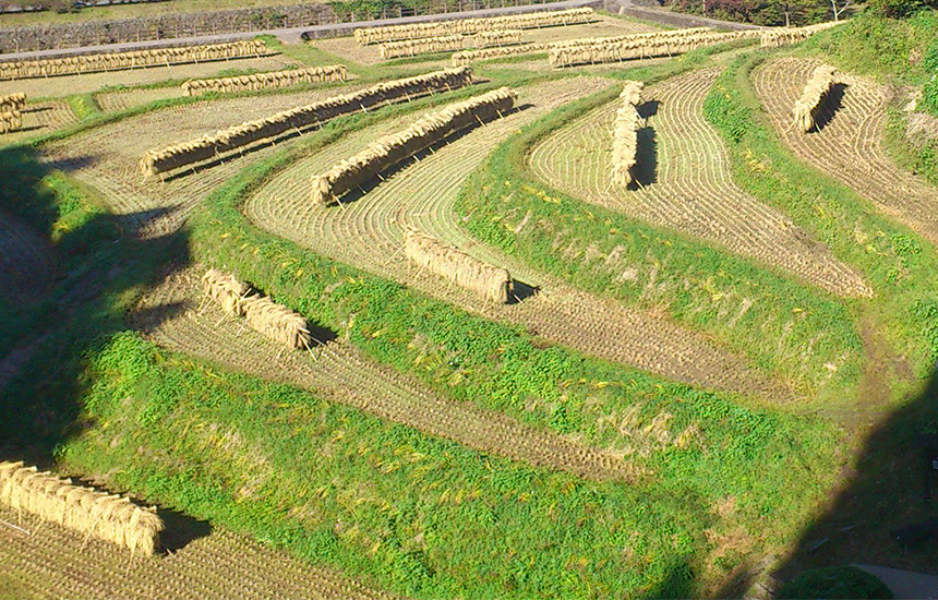 通潤橋のたもとに拡がる棚田で橋上から一望できます。通潤橋中央部から観光用の放水風景と棚田のコラボレーションは見事です。通潤橋は熊本県山都町にある農業灌漑遺構で石造単アーチ橋で、2023年(令和5年)には橋などの土木構造物としては全国初の国宝に指定されています。対岸の豊富な水を水源の無い広大な白糸台地の棚田へ導水するため約150年前に構築された施設でたび重なる熊本県の地震にも耐える強固な石橋です。現在では農業用水はこの橋ではなく川底を通るヒューム管が使われています。